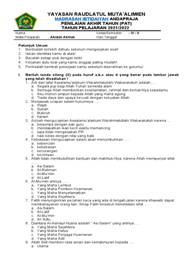 Berikut adalah beberapa contoh tipe soal yang umum ditemukan dalam ujian Akidah Akhlak kelas 4 semester 1, beserta penjelasannya: