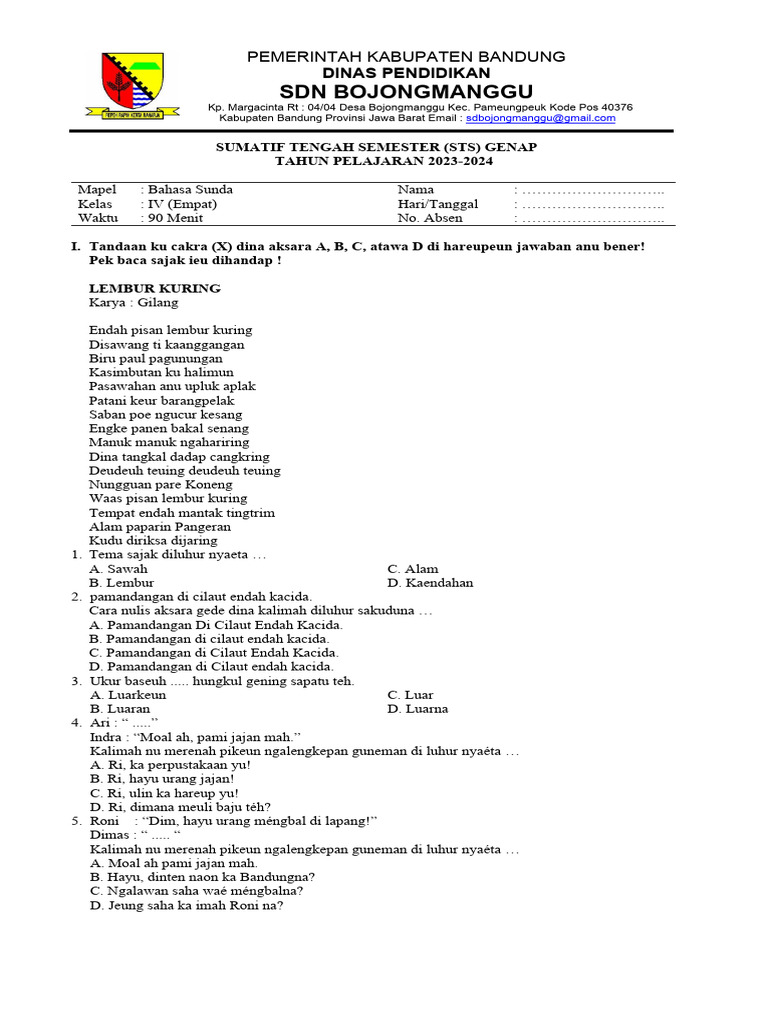 Soal PTS Bahasa Sunda biasanya disajikan dalam beberapa format untuk menguji berbagai aspek pemahaman siswa: